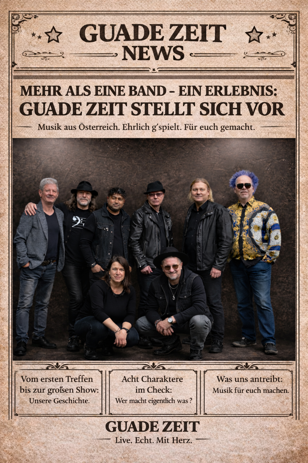 Guade Zeit ist eine Band aus Wien, die für ehrliche, handgemachte Musik mit Herz steht. Mit einer kraftvollen Mischung aus Austropop, Rock und gefühlvollen Dialekttexten bringt die Band genau das auf die Bühne, was heute oft fehlt: Echtheit, Persönlichkeit und musikalische Leidenschaft.